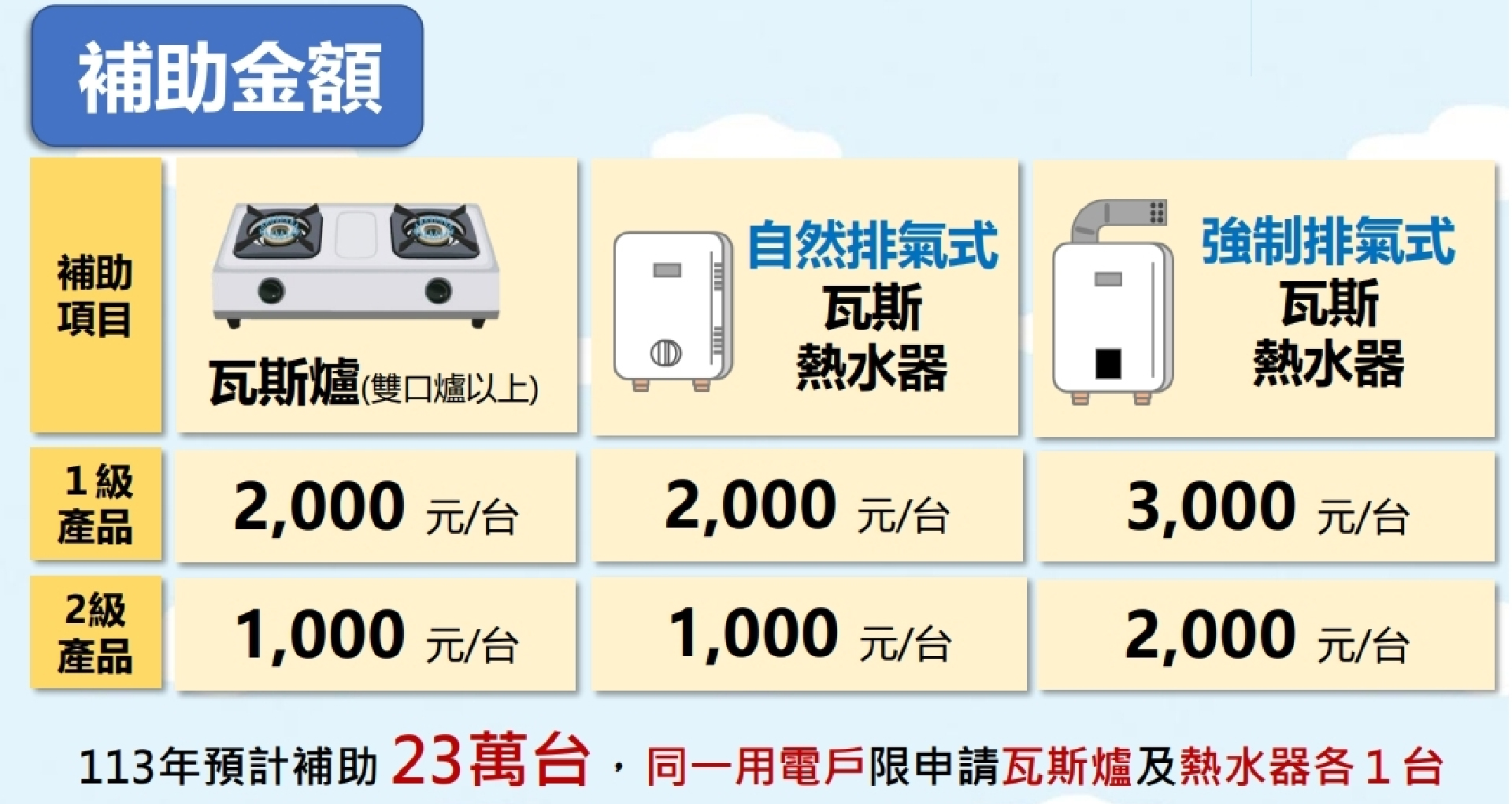 政府將於2024年1月1日起推出「住宅燃氣器具節能產品補助」措施,民眾購買1級或2級能效的瓦斯爐或熱水器,每戶申請補助以瓦斯爐與熱水器各1台為限,預計可補助23萬台節能產品,投入經費約4億元。