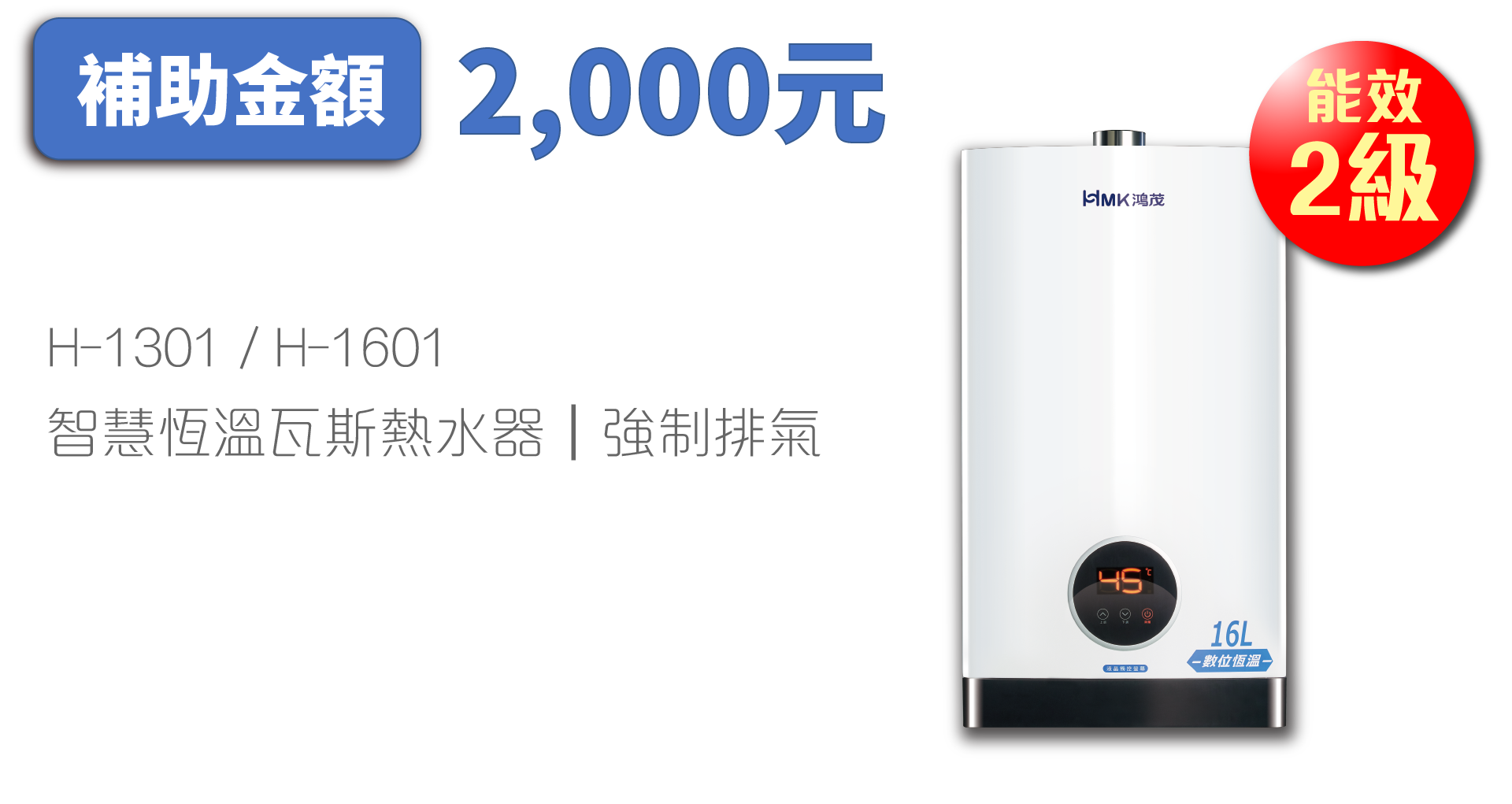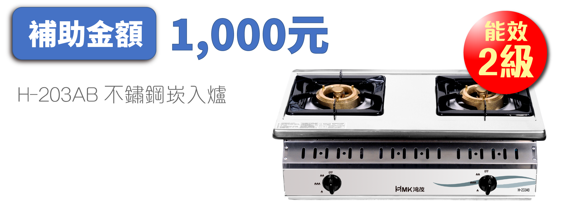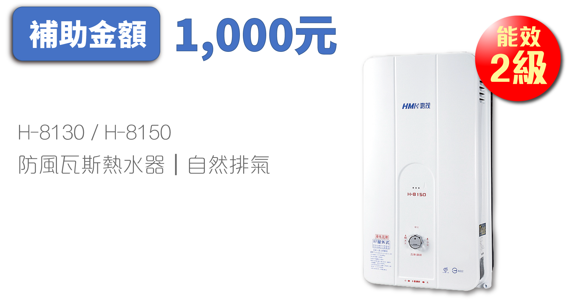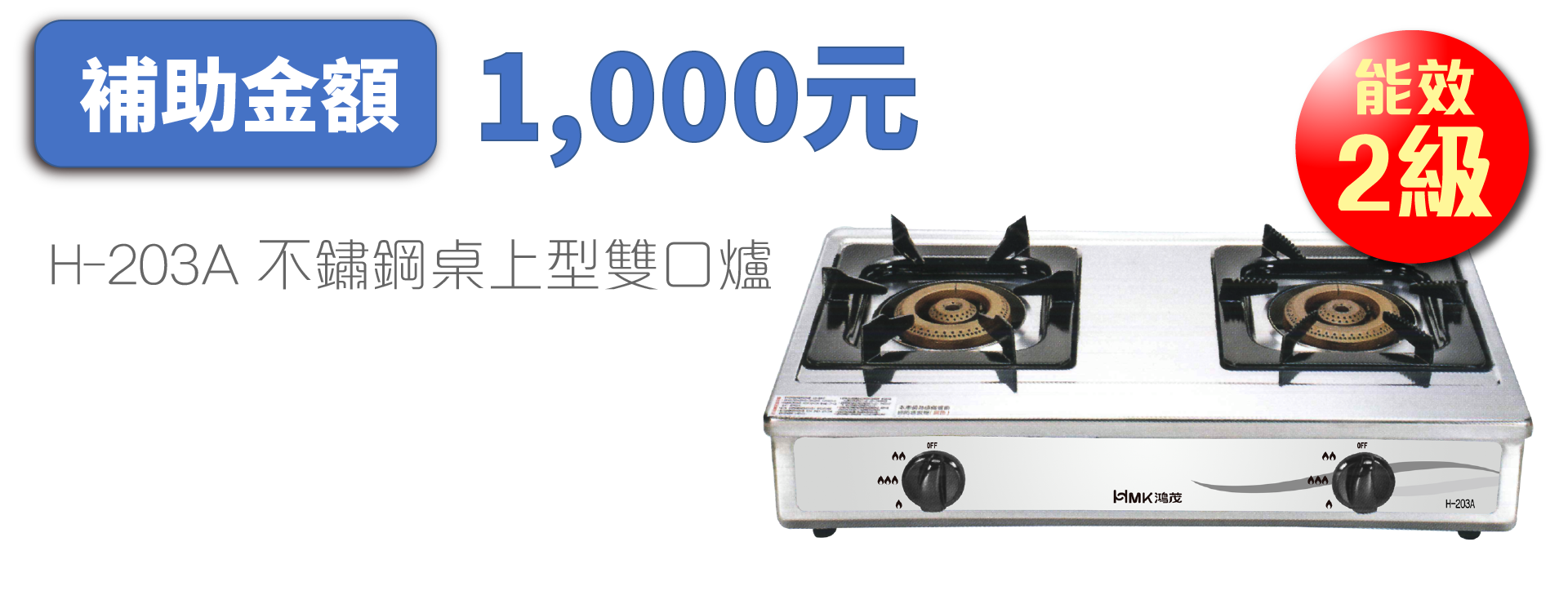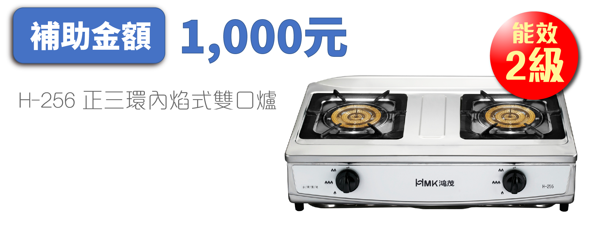 各補助產品項目及每台補助金額分別為「瓦斯爐(雙口爐以上)」1級能效2000元、2級能效1000元;「自然排氣式熱水器」1級能效2000元、2級能效1000元;「強制排氣式熱水器」1級能效3000元,2級能效2000元,HMK鴻茂產品之瓦斯爐、熱水器也在補助行列中。